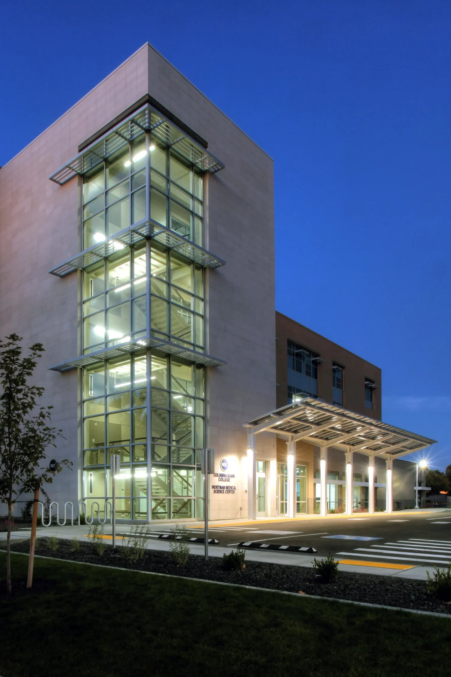 This medical training facility is a partnership between Kadlec Medical Center and Columbia Basin College. The first two floors are utilized by Kadlec Medical Center for a working Family Health Residency Clinic and office and teaching spaces. CBC occupies the upper two floors, providing programs such as Medical Assistant and Paramedic training with several classrooms and faculty offices.